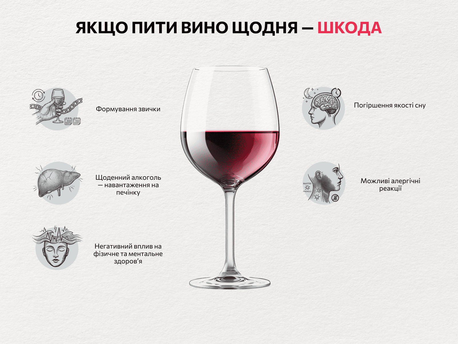 - Пити вино щодня (як, втім, і будь-який інший алкоголь) може бути небезпечним для здоров’я печінки.