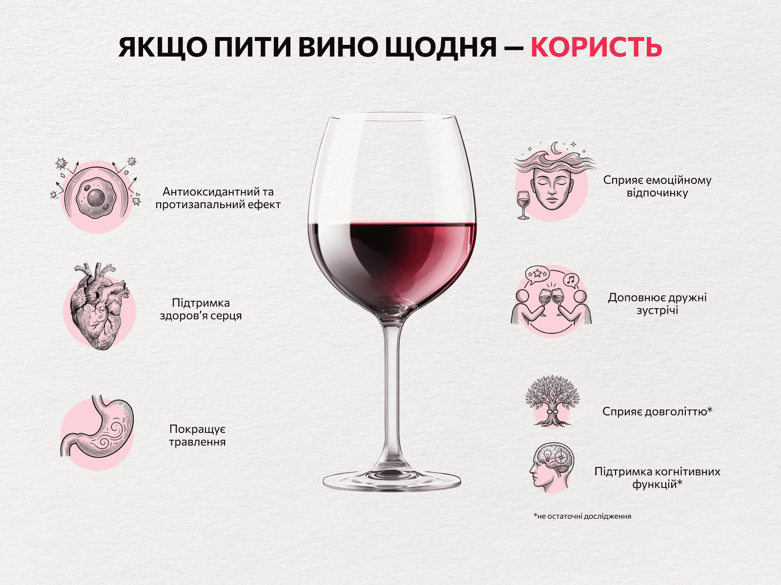 Как вывод можем сказать, что умеренное потребление натурального вина будет даже полезно для здоровья. Но все же лучше не ежедневно. Особенно если у тебя есть какие-то проблемы со здоровьем. И, конечно, всегда выбирай качественный продукт, то есть хорошее виноградное вино, натуральное и настоящее — это обеспечит тебе только хорошее самочувствие и приятные впечатления от вкусного напитка.
