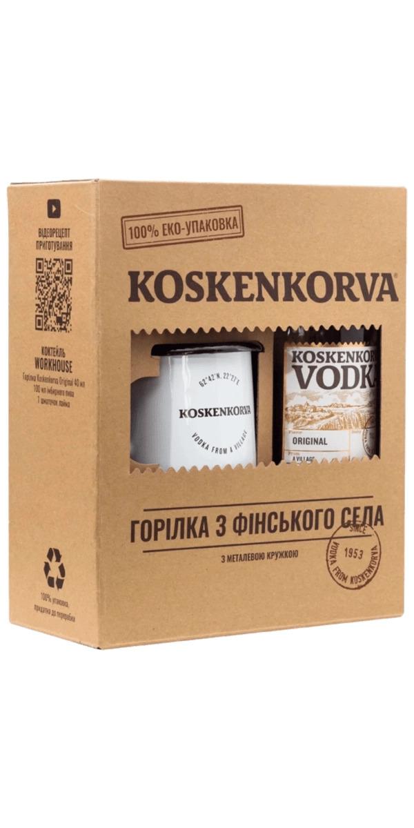 Классическая финская водка Koskenkorva в наборе с металлической чашкой станет хорошим подарком, ведь в этой коробке содержится два удовольствия: бутылка классической Koskenkorva Original 0.7 и стильная металлическая кружка. Которая, кстати, выглядит красиво — по-мужски лаконично и сурово, поэтому такой презент получателю точно приглянется.